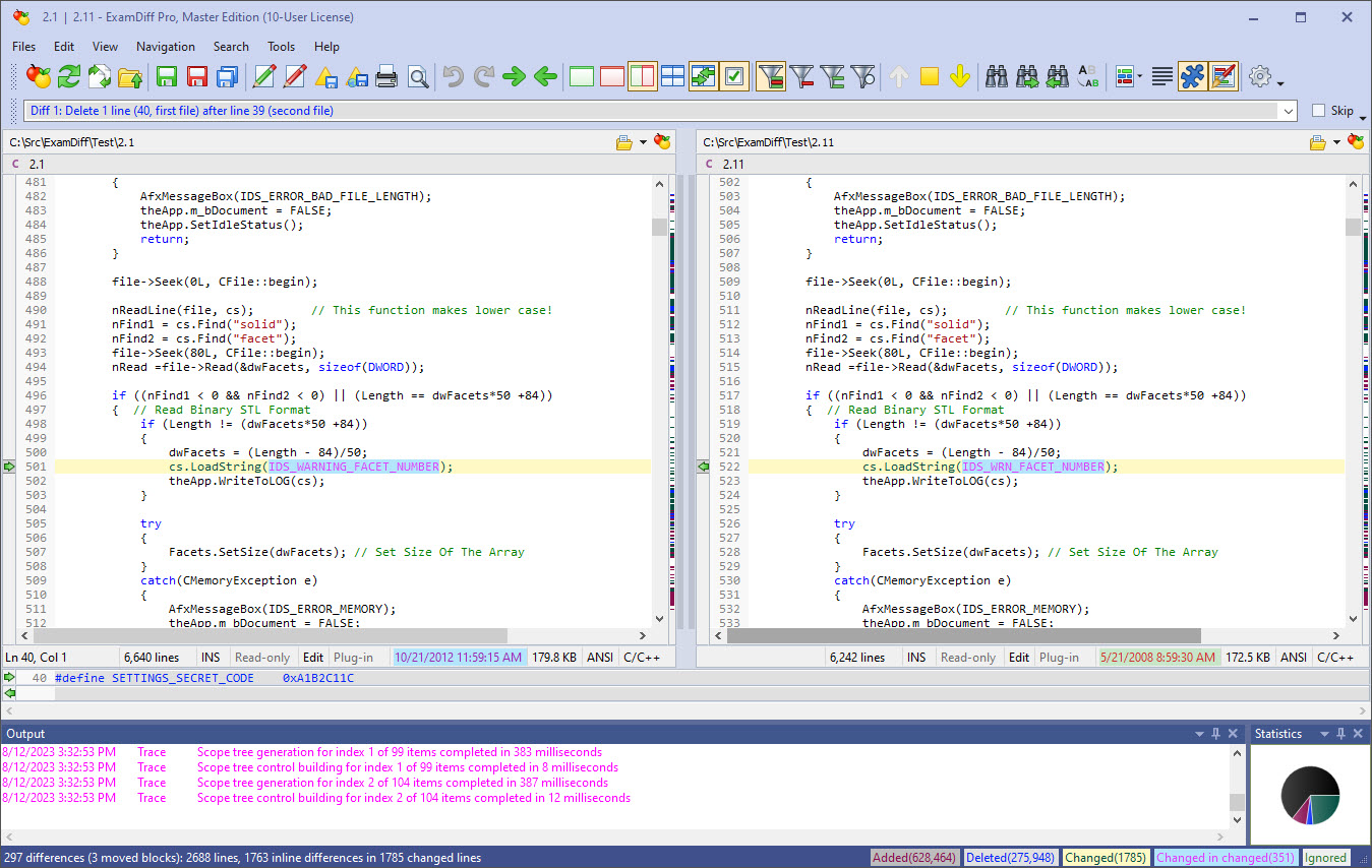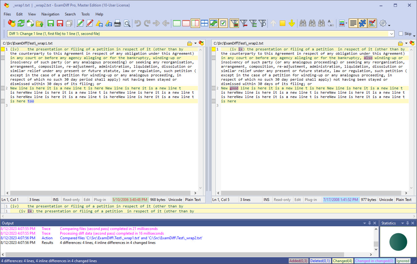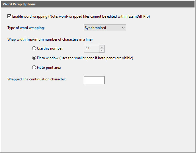 If the files you compare have lines too long to fit in the window, you can enable Word Wrapping to quickly see the complete lines.