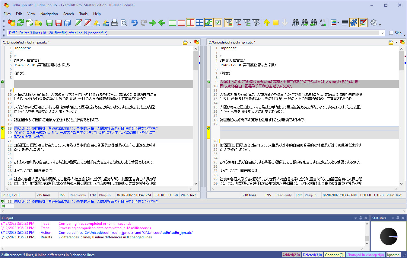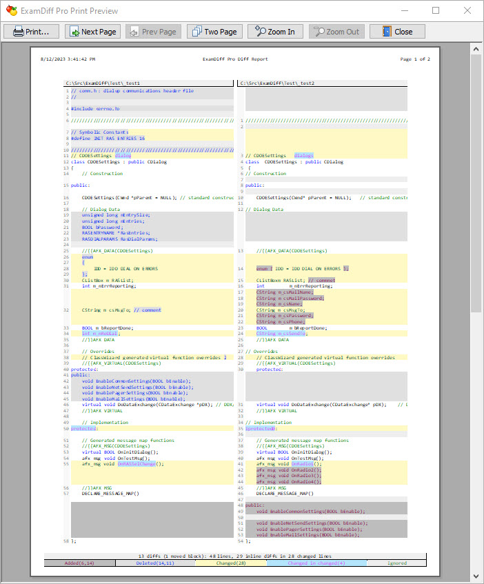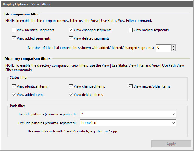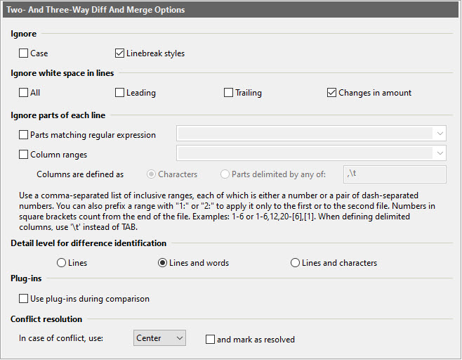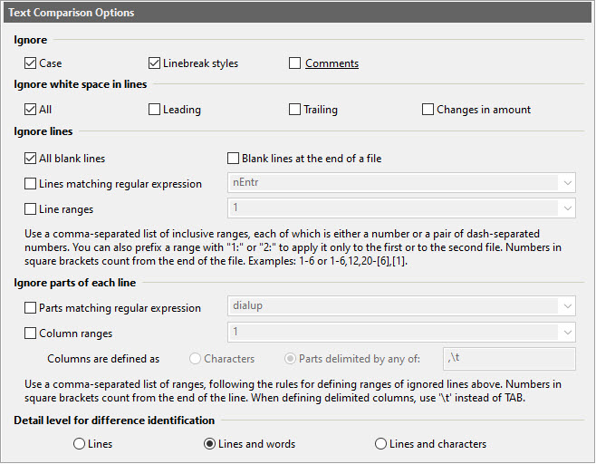 From this page you can make ExamDiff Pro ignore certain lines or parts of lines in text file comparison, that is, not mark them as different. You can also set the detail level for file comparison.