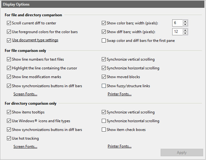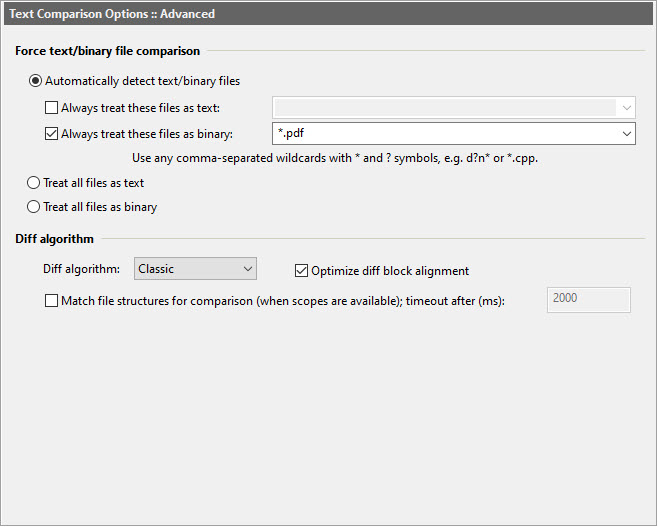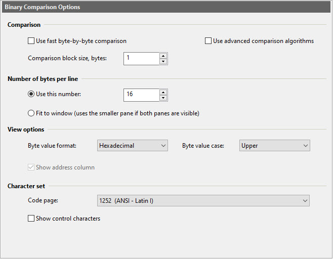 From this page you can set a number of options that pertain to binary comparison, such as the comparison block size, the number of bytes shown per line, and byte format and character set used.
