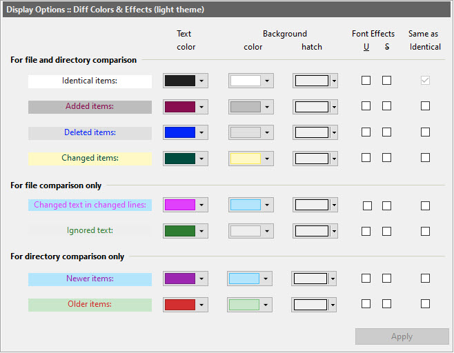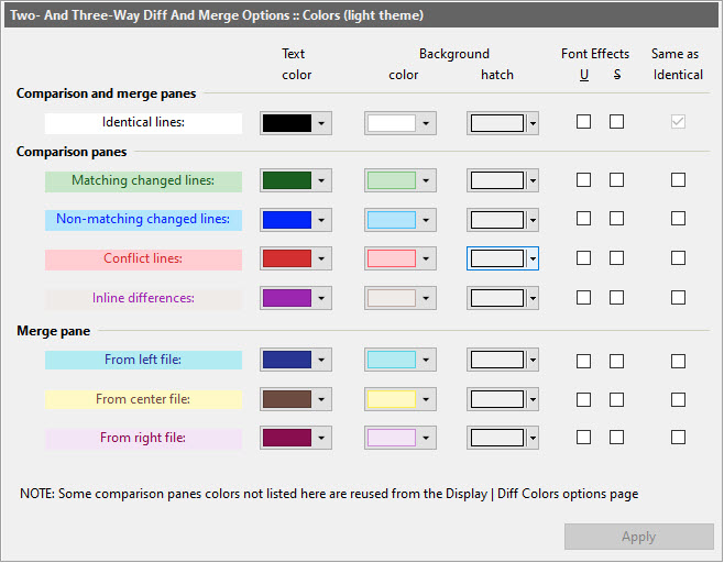 From this page you can select the colors used for all of the difference identification types, as well as font effects.